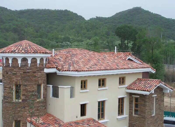 3、西班牙瓦本身具有弧度,使得整體屋面具有較好的層次感,又因多種顏色混鋪,使得整體屋面具有很好的視覺效果;