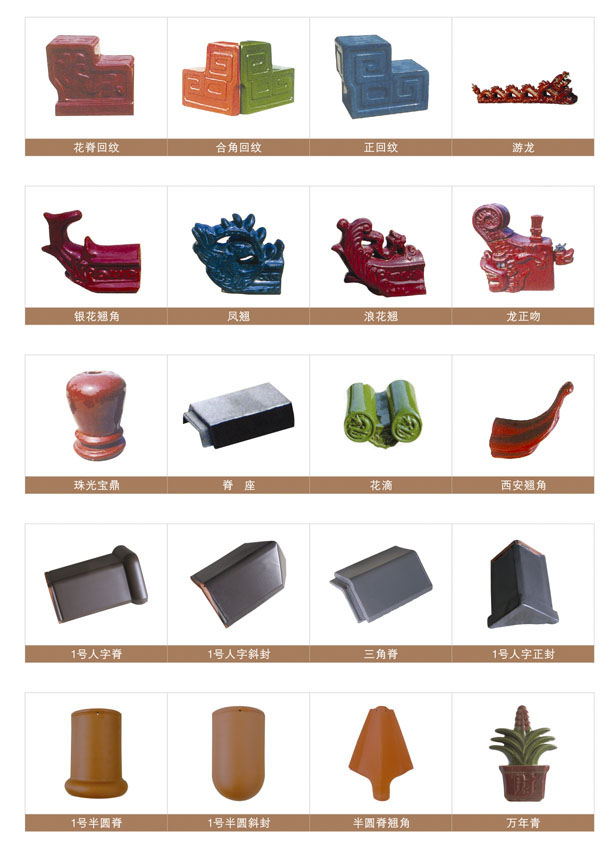 公司主要生產(chǎn)品種有:琉璃瓦系列、陶瓷瓦系列、石板瓦系列、平板瓦系列、西班牙瓦系列、S瓦系列、圓筒瓦系列、仿古瓦系列以及各類屋脊走獸、花窗欄桿等。宜興琉璃瓦質(zhì)地優(yōu)良,規(guī)格齊全,造型古樸典雅,釉色豐富多彩, 富有濃郁的民族特色。如西班牙瓦,S瓦,造型起伏多變,具有古典的南歐風(fēng)格,鋪蓋后自然高雅,格調(diào)獨(dú)特,適合西式風(fēng)格的建筑;圓筒瓦系列,造型簡(jiǎn)樸平實(shí)。融合了東方文化的風(fēng)土色彩,鋪蓋后秀麗大方,輕盈淳樸,適合中國(guó)古典建筑。