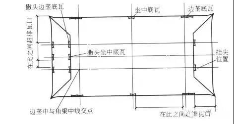 1)量出前后坡檐頭邊壟中點(diǎn)至翼角轉(zhuǎn)角處的距離,按照同樣的距離,向撒頭量出撒頭部位邊壟中。