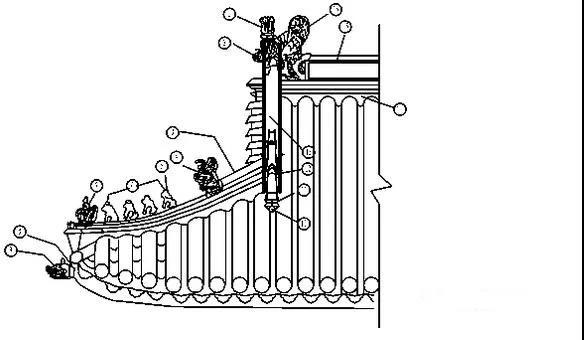⑦-仙人騎鳳 ⑧-遮朽瓦 ⑨-套獸 ⑩-池水 11-瓦條 12-獸座 13-垂獸