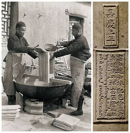 右圖瓦身背面有上下兩個(gè)長(zhǎng)方形的戳記,上面的戳記寫(xiě)著“嘉慶三年”,下面的寫(xiě)著“窯戶趙士林、配色徐孟壽、房頭陳千祥、窯匠許萬(wàn)祥”,旁邊尚有滿文對(duì)照。戳記除了說(shuō)明琉璃的燒造年代,還證明琉璃渠官窯燒造有著明確的分工以及責(zé)任追認(rèn)制度。